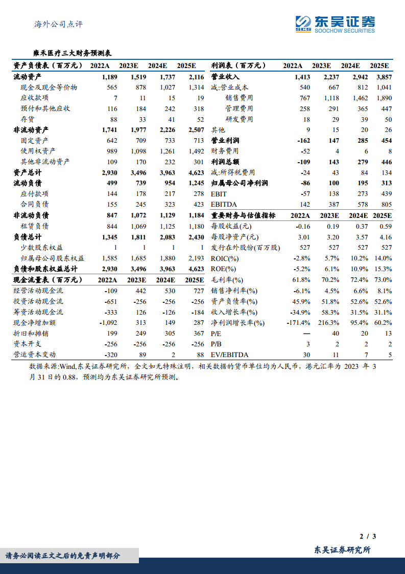 当前市值对应2023年至2025年的市盈率(P/E)分别为40倍、20倍和13倍。鉴于公司作为国内最大的毛发服务提供商,上市后加速扩张渠道,且疫后有望持续恢复增长,东吴证券维持对雍禾医疗的“买入”评级。