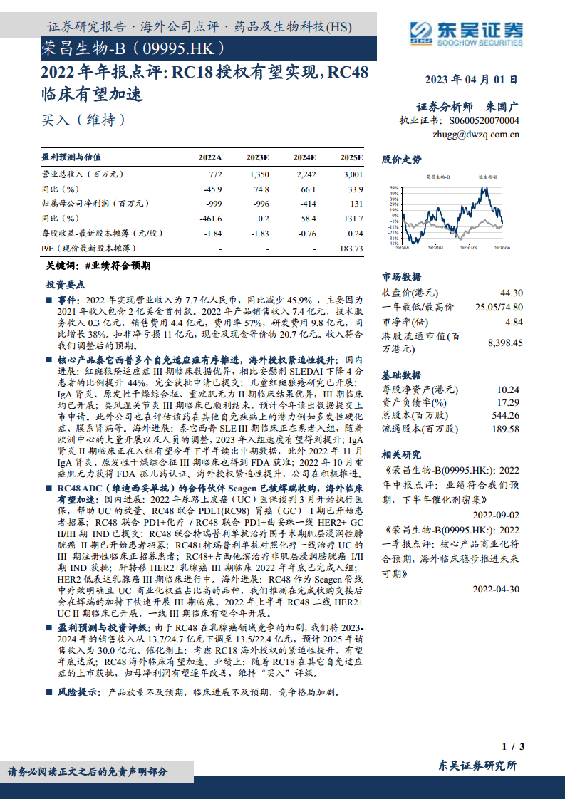 荣昌生物-B在2022年经历了营收调整,但其核心产品泰它西普(RC18)和维迪西妥单抗(RC48)的全球临床开发持续取得突破性进展。泰它西普在国内红斑狼疮等多个自免适应症上已提交上市申请或进入III期临床,海外授权进程加速;维迪西妥单抗在国内尿路上皮癌医保放量,并受益于合作伙伴Seagen被辉瑞收购,其海外临床有望显著提速。尽管短期内公司仍处于亏损状态,但随着新适应症的获批上市和国际化战略的深入推进,预计公司盈利能力将逐步改善,并在2025年实现盈利。分析师维持“买入”评级,但提示投资者关注产品放量、临床进展及市场竞争加剧等潜在风险。