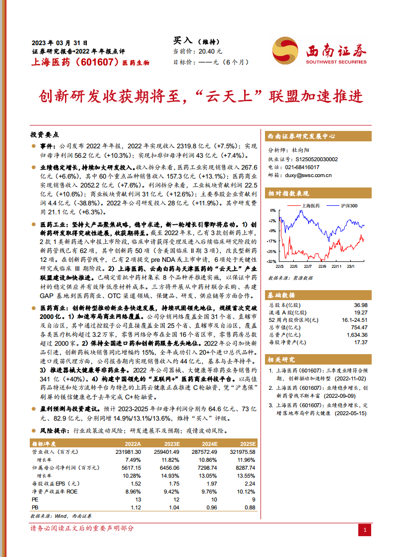 上海医药在2022年展现了稳健的财务表现和强劲的增长潜力。公司通过持续加大研发投入,推动创新药管线进入收获期,并积极构建“云天上”产业联盟以优化中药产业链。同时,其医药商业板块通过广泛的网络覆盖、领先的进口药和创新药服务以及“互联网+”科技平台的建设,实现了规模和效率的双重提升。尽管面临行业政策和研发进展等风险,但公司清晰的战略布局和多元化的增长引擎预示着其未来业绩的持续向好。分析师维持“买入”评级,反映了对公司长期发展前景的信心。