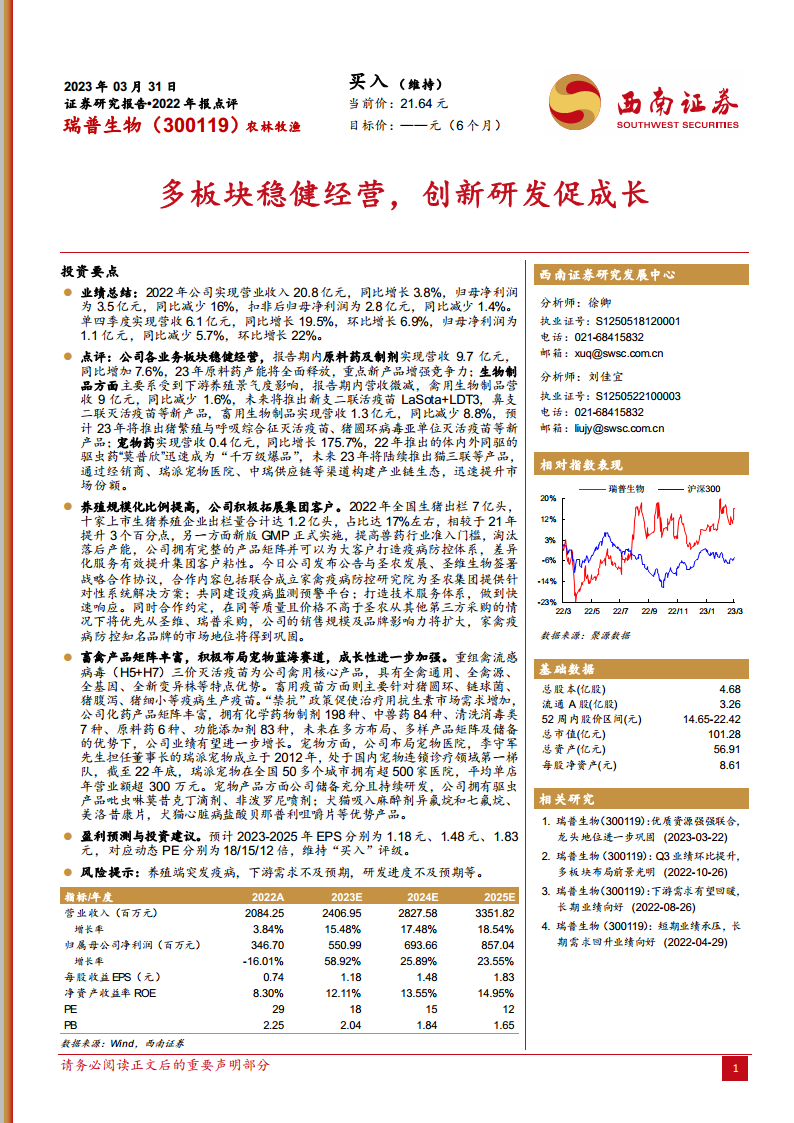 根据分析师预测,瑞普生物2023年至2025年的每股收益(EPS)预计分别为1.18元、1.48元和1.83元,对应的动态市盈率(PE)分别为18倍、15倍和12倍。鉴于公司多板块稳健经营、创新研发驱动成长以及在宠物蓝海市场的积极布局,分析师维持“买入”评级。