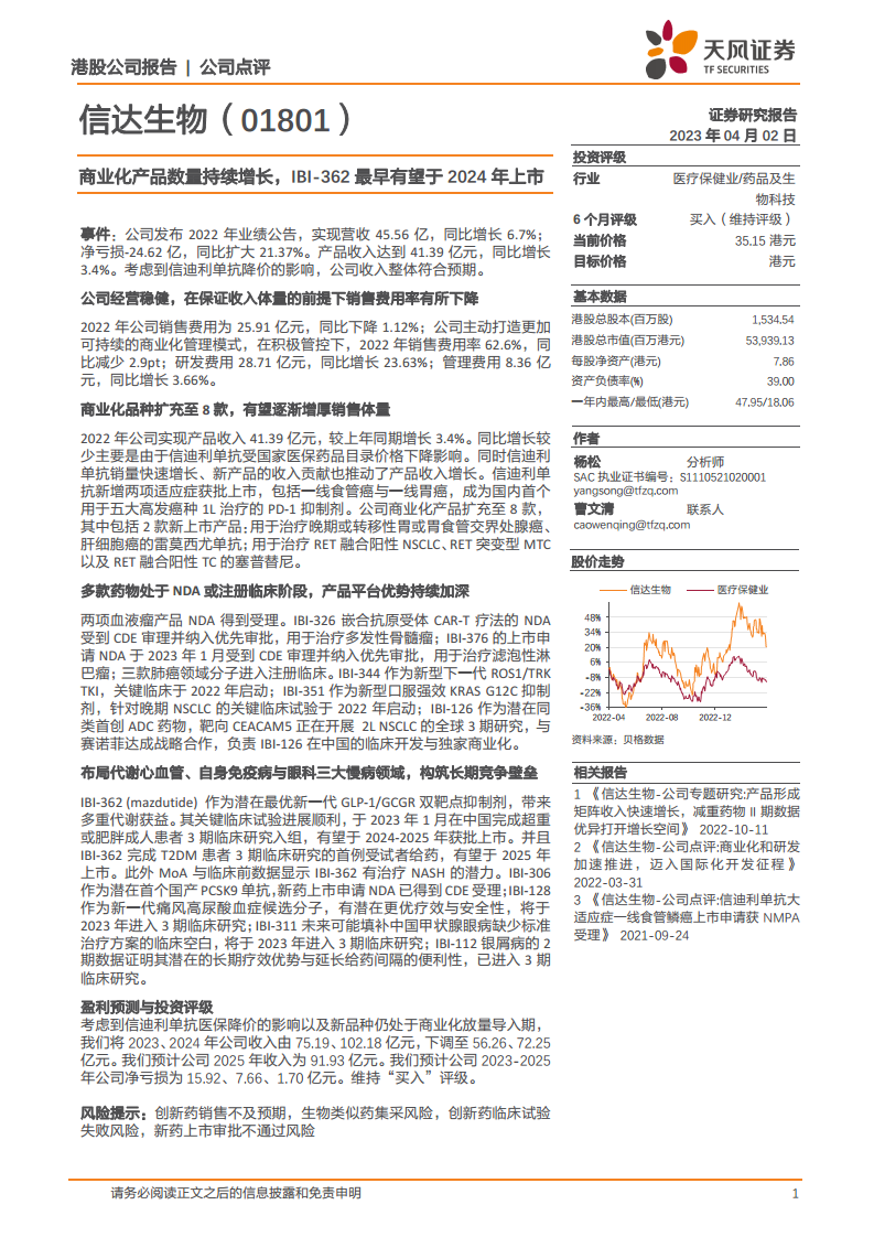 信达生物(01801):商业化产品数量持续增长,IBI-362最早有望于2024年上市