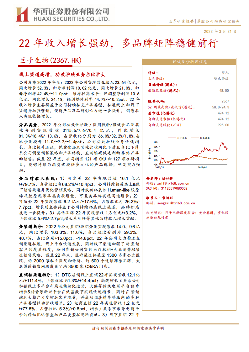 巨子生物(02367):22年收入增长强劲,多品牌矩阵稳健前行