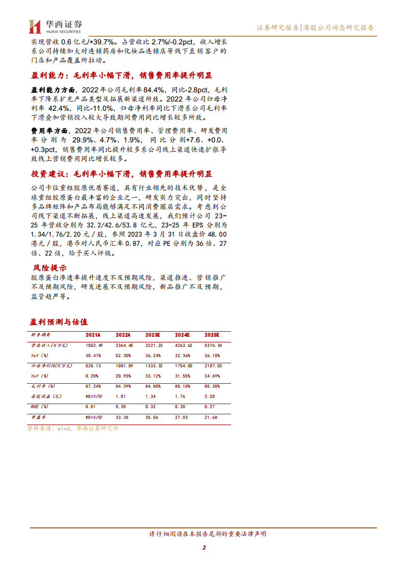 巨子生物在2022年展现出强劲的业绩增长,营业收入和归母净利润分别同比增长52.3%和21.0%。这一增长主要由功效性护肤业务的爆发式增长(同比增长81.3%,占比66.0%)和以可复美品牌为代表的多品牌矩阵的成功运营所驱动。公司积极拓展直销渠道,特别是DTC店铺线上直销实现111.4%的高速增长,使其在整体营收中的占比达到59.3%。尽管毛利率因产品结构调整和新渠道拓展略有下降,且销售费用率因线上营销投入增加而显著提升,但公司在重组胶原蛋白领域的领先技术优势和持续的研发投入,为其未来的持续增长奠定了基础。分析师基于公司线下渠道的不断拓展和线上渠道的高速发展,预测未来三年营收和EPS将保持稳健增长,并给予“买入”评级。同时,报告也提示了胶原蛋白渗透率、渠道推广、研发及新品推广不及预期以及监管趋严等潜在风险。