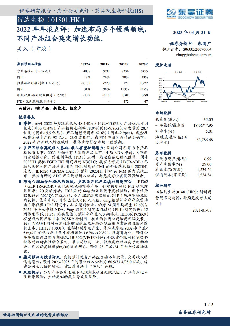信达生物2022年业绩虽受PD1降价和疫情影响,但凭借多元化的产品组合和前瞻性的研发管线,为未来增长奠定了坚实基础。公司在肿瘤领域持续深化布局,并积极拓展心脑血管和糖尿病等慢病蓝海市场,多款差异化创新产品有望填补用药空白,驱动收入和利润实现快速增长,预计在2024年实现盈利转正。