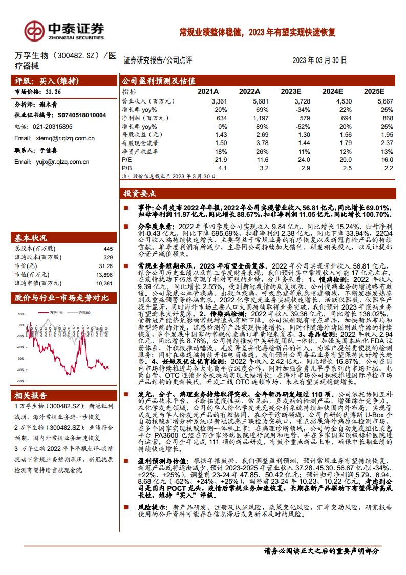 万孚生物在2022年实现了强劲的业绩增长,主要得益于常规业务的恢复和新冠检测产品的贡献,展现了其作为POCT领域龙头的市场地位和运营韧性。尽管短期内受研发投入和资产减值影响,第四季度利润有所承压,但公司常规业务预计在2023年将全面复苏,并有望重回高速增长轨道。通过在化学发光、分子诊断和病理诊断等领域的持续技术创新和新品研发,万孚生物为其中长期业绩增长奠定了坚实基础。同时,报告也提示了新产品研发注册、政策变化和汇率波动等潜在风险。综合来看,公司未来发展前景积极,维持“买入”评级。