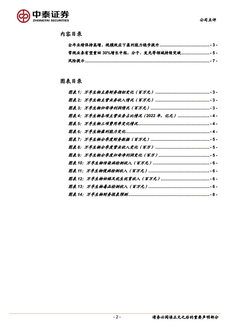 万孚生物在2022年实现了显著的业绩增长,营业收入和归母净利润分别同比增长69.01%和88.67%,主要得益于常规业务的恢复和新冠检测产品的贡献。尽管2022年第四季度利润因投入增加和资产减值有所下降,但公司预计2023年常规业务将全面复苏,并有望重回30%的增长中枢。