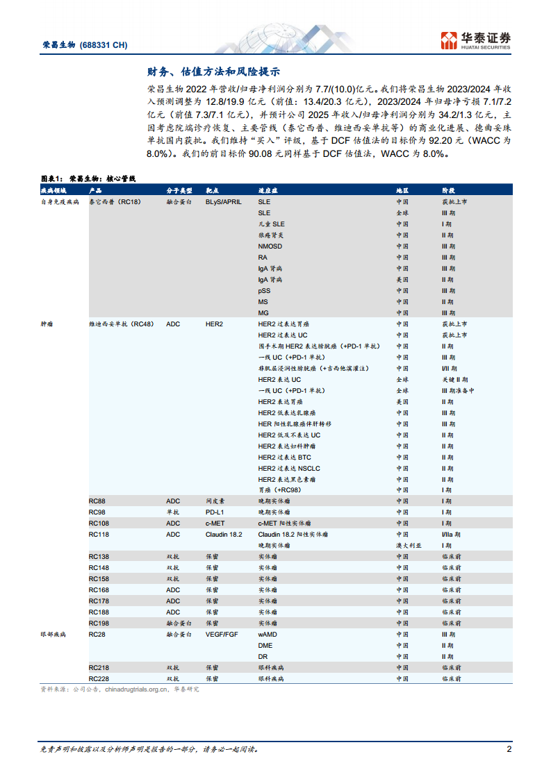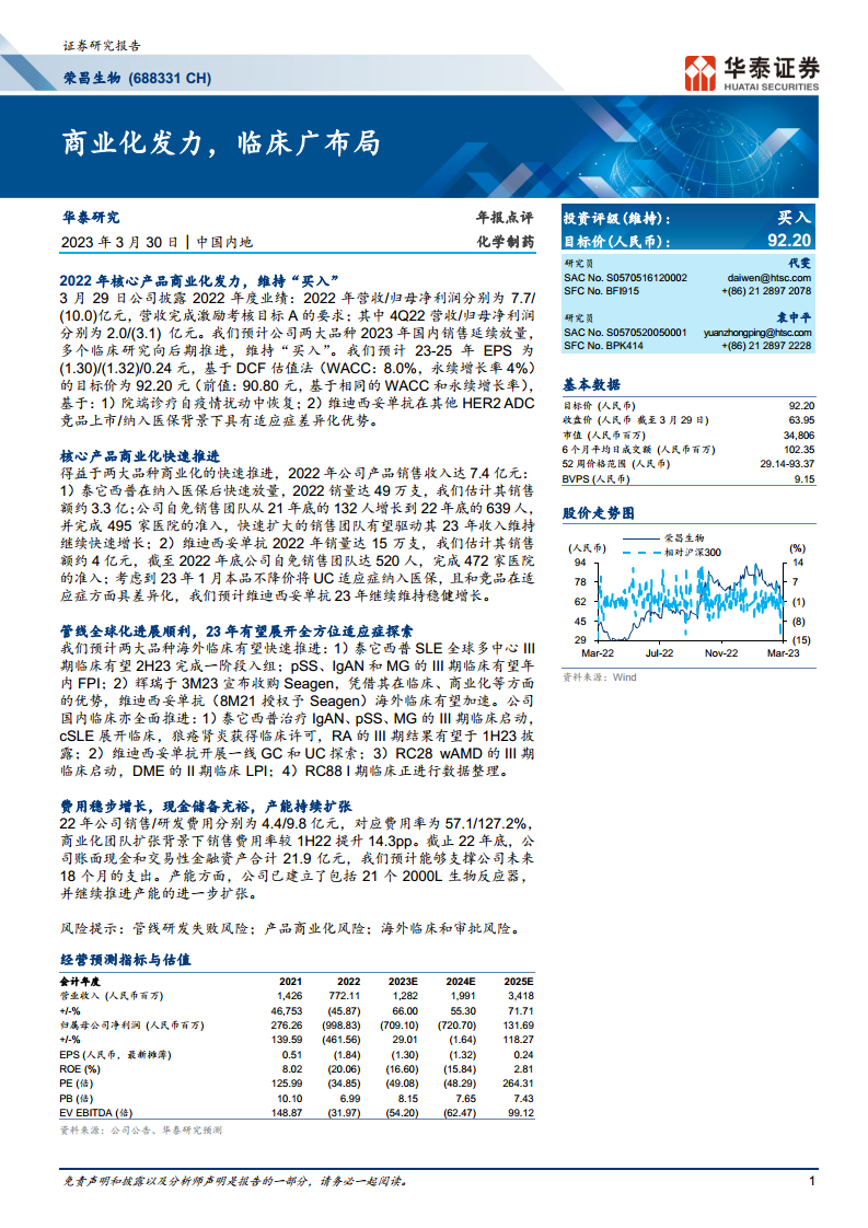 荣昌生物在2022年通过核心产品泰它西普和维迪西妥单抗的商业化发力,实现了营收的显著增长,并成功达成激励考核目标。公司在自身免疫和肿瘤领域拥有丰富的创新管线,并在全球范围内积极推进临床开发,尤其是在海外市场取得了重要进展。尽管目前仍处于亏损状态,但充裕的现金储备和持续扩张的产能为公司未来的研发投入和商业化推广提供了坚实保障。华泰研究维持“买入”评级,并基于DCF估值法上调目标价至92.20元,反映了对公司长期增长潜力和创新能力的信心,但投资者仍需关注管线研发、产品商业化及海外审批等潜在风险。