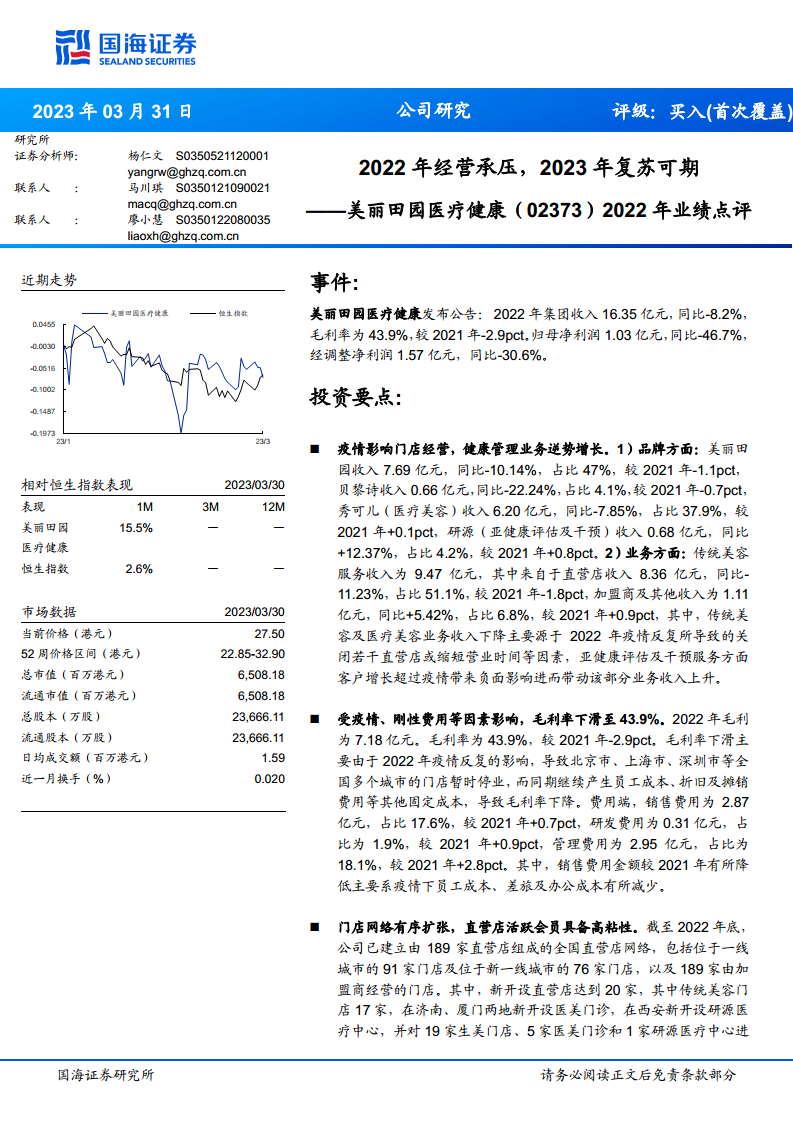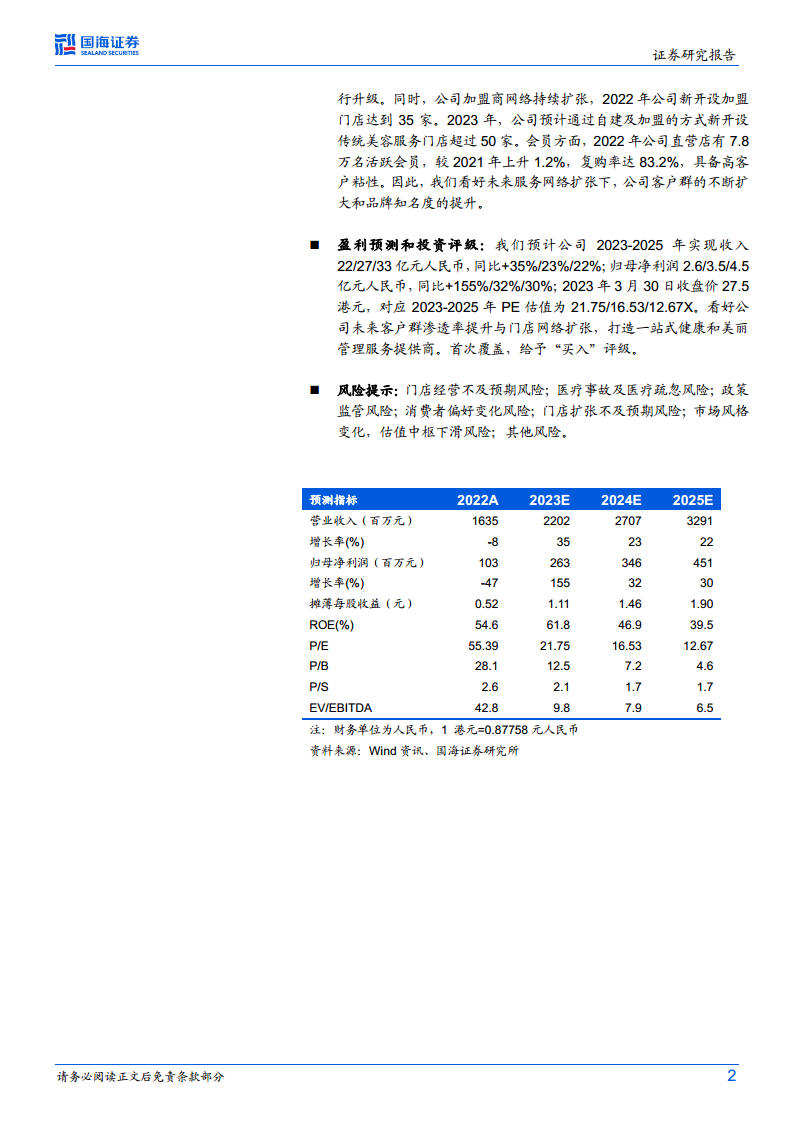 基于2023年3月30日收盘价27.5港元,公司对应2023-2025年的PE估值分别为21.75倍、16.53倍和12.67倍。国海证券认为,公司未来在客户群渗透率提升和门店网络扩张方面具备巨大潜力,有望打造成为一站式健康和美丽管理服务提供商。鉴于此,国海证券首次覆盖美丽田园医疗健康,并给予“买入”评级。