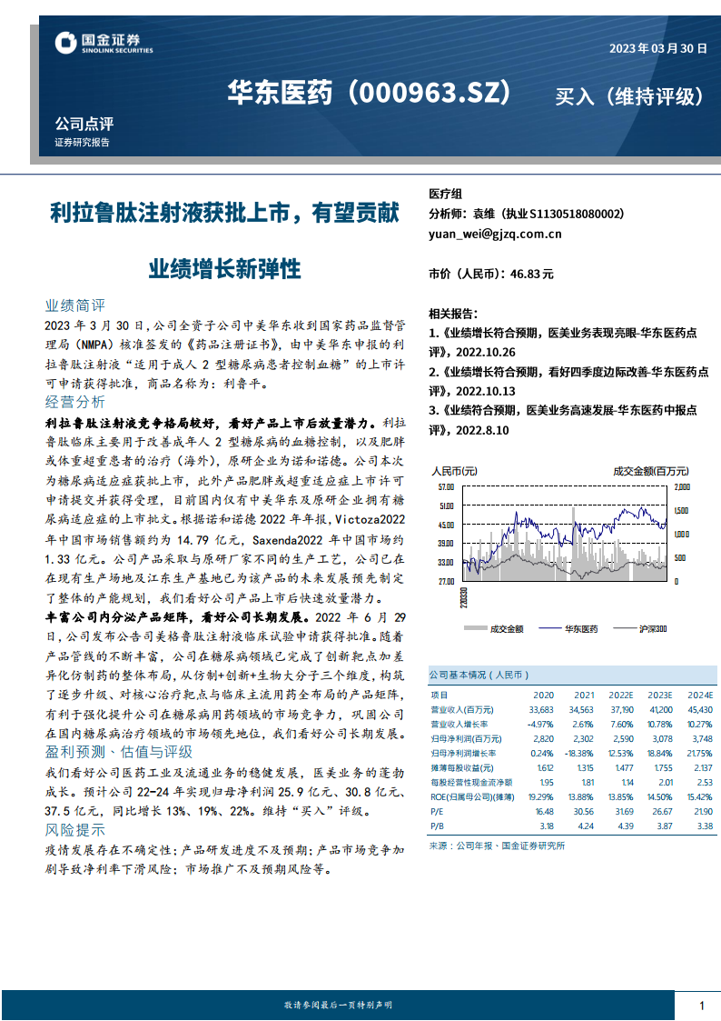 本报告对华东医药的最新业绩和未来发展进行了专业分析。核心观点在于,随着利拉鲁肽注射液获批上市,华东医药在2型糖尿病治疗领域取得了重要进展,其市场竞争地位得到显著提升。公司通过“仿制+创新+生物大分子”的战略布局,持续丰富内分泌产品管线,尤其是在糖尿病治疗领域形成了全面的产品矩阵,为长期增长奠定了坚实基础。尽管存在疫情不确定性、研发及市场推广风险,但基于对公司医药工业、流通及医美业务的稳健增长预期,国金证券维持了华东医药的“买入”评级,预计未来几年归母净利润将保持两位数增长。