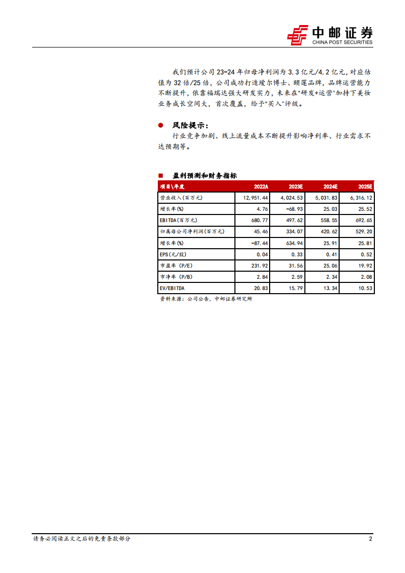 基于以上分析,中邮证券预计公司2023年和2024年归母净利润分别为3.3亿元和4.2亿元,对应估值分别为32倍和25倍。鉴于公司成功打造瑷尔博士、颐莲等品牌,品牌运营能力不断提升,并依托福瑞达强大的研发实力,未来在“研发+运营”的加持下,美妆业务成长空间巨大。因此,首次覆盖给予“买入”评级。同时,报告提示了行业竞争加剧、线上流量成本不断提升影响净利率以及行业需求不达预期等风险。