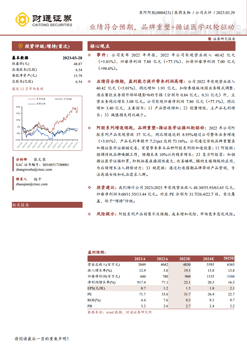 东阿阿胶在2022年取得了超出预期的业绩,营业收入和归母净利润均实现显著增长,特别是核心阿胶系列产品表现强劲,毛利率大幅提升。这主要得益于公司聚焦主业、提升盈利能力的战略执行,以及减值损失的有效控制。展望未来,公司将继续以“品牌重塑”和“循证医学证据链完善”为双轮驱动,通过差异化的产品策略和科学化的市场拓展,进一步巩固阿胶系列产品的市场领导地位。财通证券研究所首次覆盖并给予“增持”评级,预测公司未来几年将保持稳健的两位数增长,且估值水平将逐步趋于合理。尽管存在销售不及预期、成本增加和市场竞争加剧等风险,但公司稳健的财务结构、持续提升的盈利能力和清晰的战略方向,预示着其具备良好的长期投资价值。