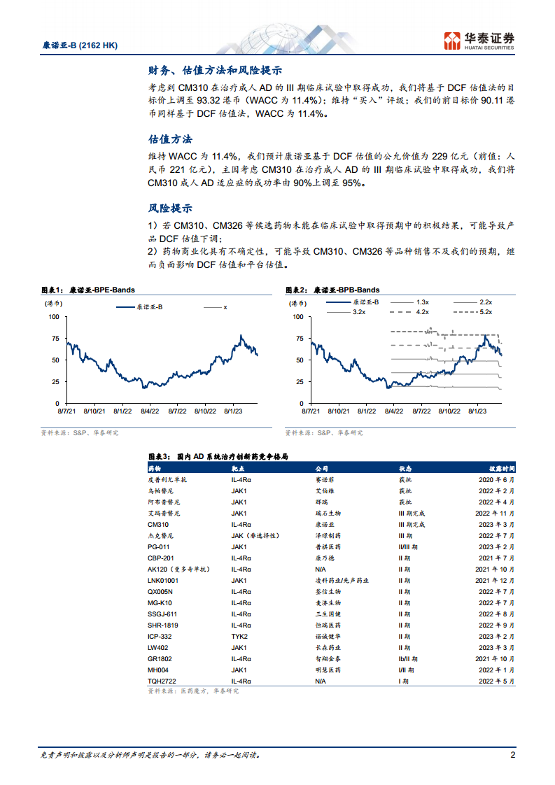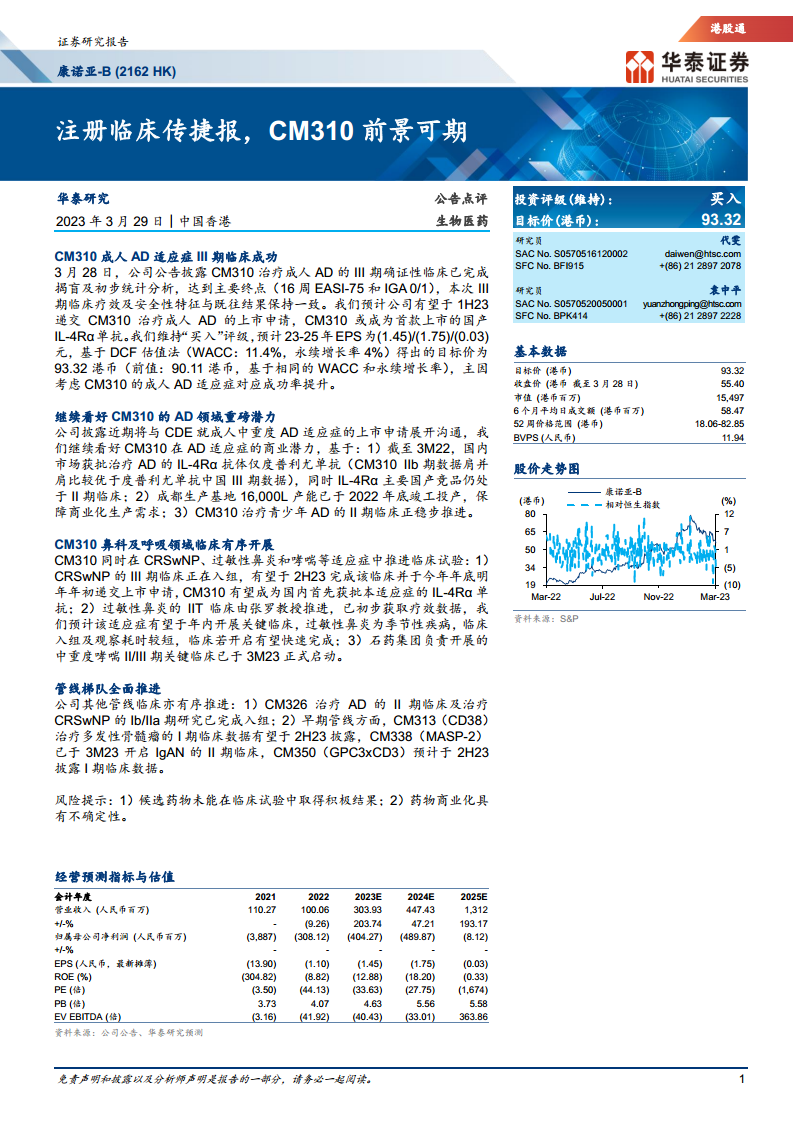 基于CM310成人AD适应症临床成功的积极结果,华泰研究维持对康诺亚-B的“买入”评级,并将目标价由90.11港币上调至93.32港币。目标价上调主要考虑到CM310成人AD适应症的成功率由90%提升至95%,反映了市场对其商业化潜力的更高预期。