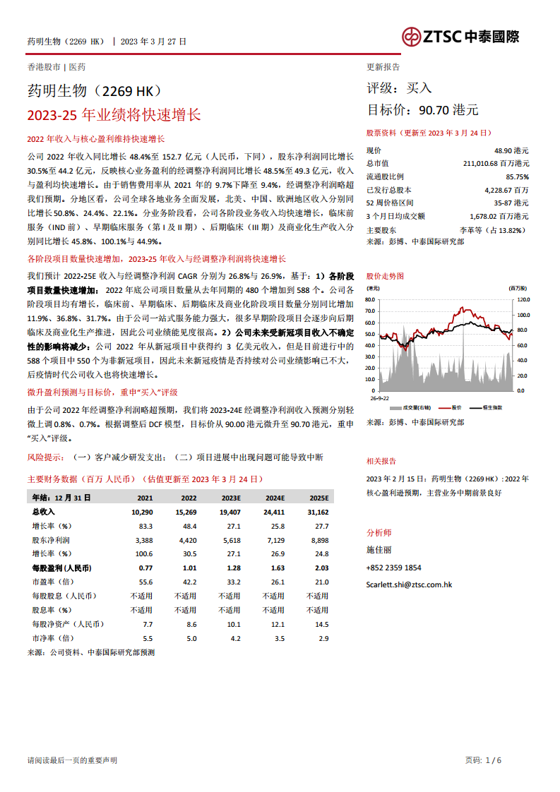 药明生物在2022年展现了强劲的业绩增长,收入和经调整净利润均实现高速增长,且全球各地区和各业务阶段均表现出色。展望未来,公司凭借不断增加的项目数量和强大的“一站式”服务能力,预计在2023-2025年将继续保持快速增长。同时,公司对新冠项目的依赖性降低,非新冠业务将成为其长期增长的核心动力。鉴于其稳健的财务表现和积极的增长前景,报告维持药明生物“买入”评级,并小幅上调目标价至90.70港元。