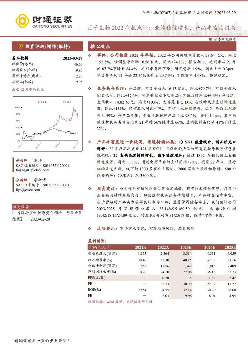 巨子生物在2022年展现出强劲的业绩增长势头,销售收入和经调整净利润均实现显著提升。公司通过优化品牌结构,特别是可复美品牌的突出表现,以及大力发展直销渠道,尤其是DTC线上直销,有效驱动了业绩增长。产品丰富度的提高和全渠道的持续拓展,进一步巩固了其市场地位。作为重组胶原蛋白领域的领导者,巨子生物凭借其技术优势和丰富的医美管线储备,具备持续增长的潜力。财通证券基于对公司未来营收和净利润的乐观预测,维持“增持”评级,同时提醒投资者关注市场需求、宏观经济及政策变化带来的风险。