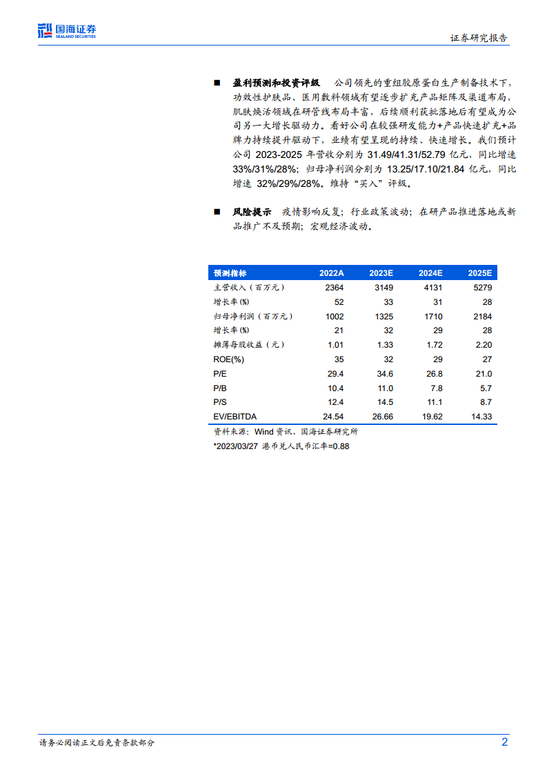 基于公司领先的重组胶原蛋白生产制备技术、功效性护肤品和医用敷料领域的产品矩阵扩充及渠道布局,以及肌肤焕活领域丰富的在研管线,分析师看好公司在较强研发能力、产品快速扩充和品牌力持续提升驱动下的持续、快速增长。