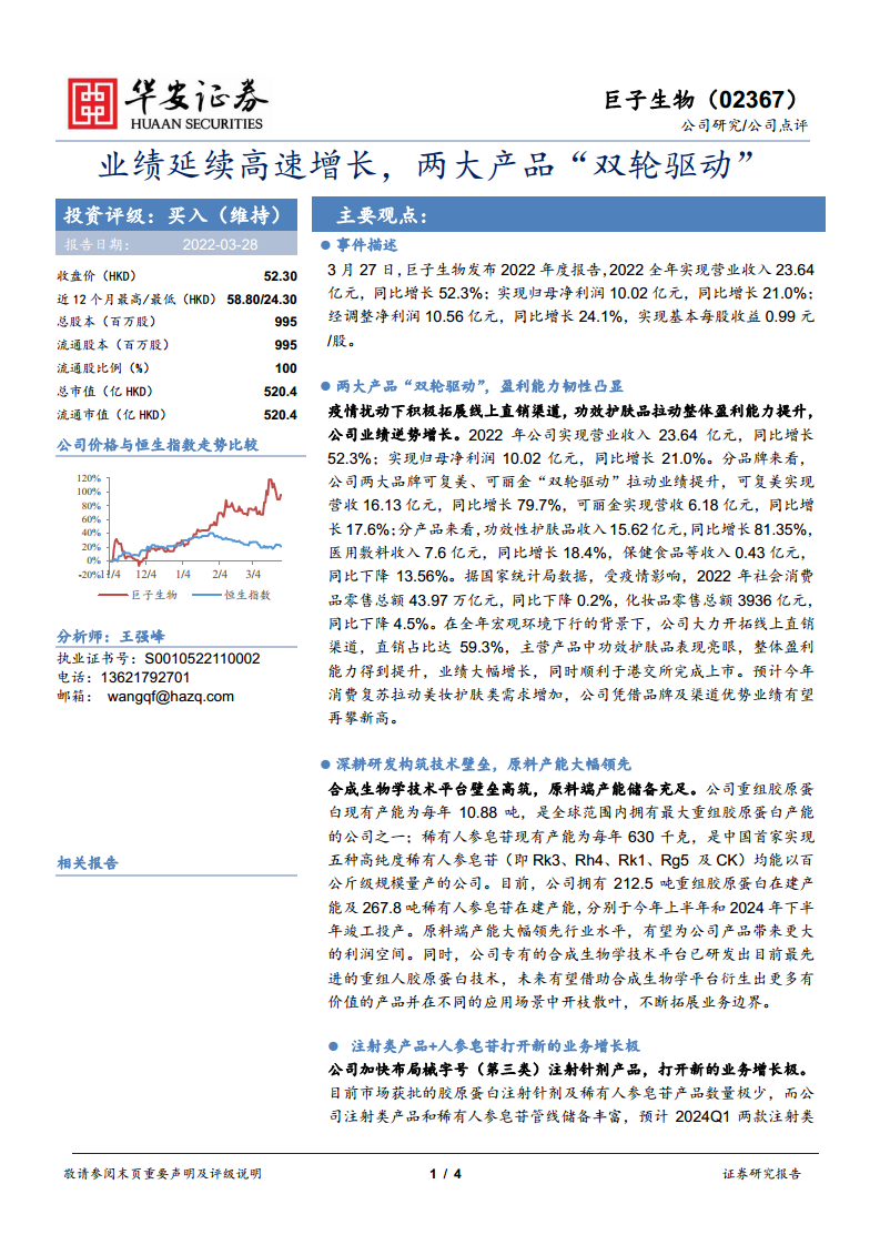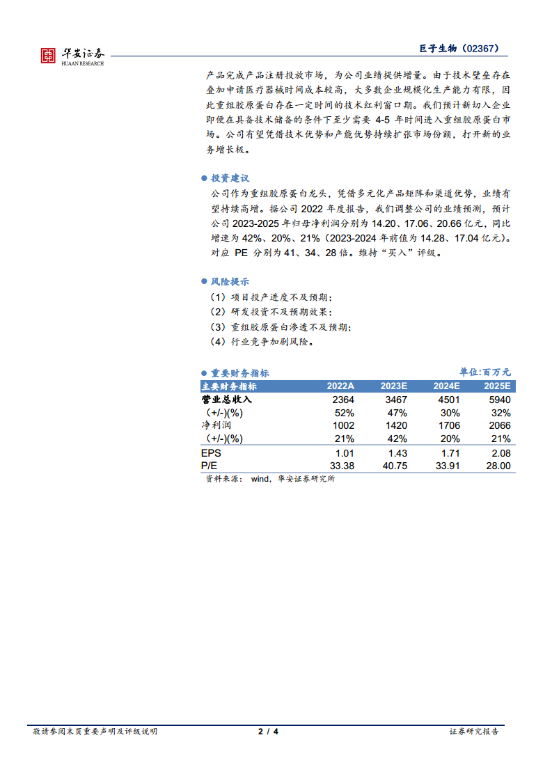巨子生物在2022年复杂的市场环境下,凭借其在功效性护肤品领域的强劲表现和线上直销渠道的有效拓展,实现了营收和利润的逆势高速增长。公司在重组胶原蛋白和稀有人参皂苷领域拥有显著的产能和技术优势,并通过持续的产能扩张和合成生物学技术创新,为未来的可持续发展奠定了坚实基础。注射类产品和稀有人参皂苷等新业务管线的布局,有望在未来几年内为公司打开新的增长空间,进一步巩固其市场领先地位。尽管面临项目投产、研发效果和市场竞争等潜在风险,但公司凭借其核心竞争力,预计将保持高速增长态势,维持“买入”评级。