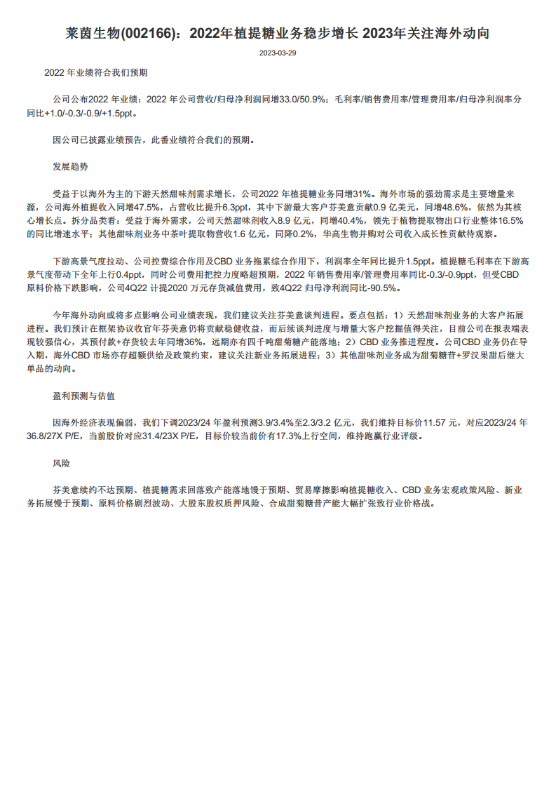 莱茵生物在2022年凭借海外市场对天然甜味剂的强劲需求,实现了营收和归母净利润的显著增长,其中植提糖业务和核心客户芬美意贡献突出。公司通过有效的成本控制提升了整体利润率,但CBD业务的存货减值对短期利润造成一定影响。展望2023年,公司将重点关注与芬美意的续约谈判、新大客户的拓展、CBD业务的审慎推进以及新甜味剂大单品的开发。尽管面临海外经济下行和多重市场风险,分析师仍维持其“跑赢行业”评级,并预计未来产能扩张将支持其长期增长。公司需密切管理各项风险,以确保业务的持续稳健发展。