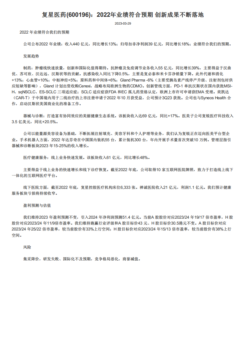 复星医药(600196)2022年业绩符合预期,创新成果不断落地