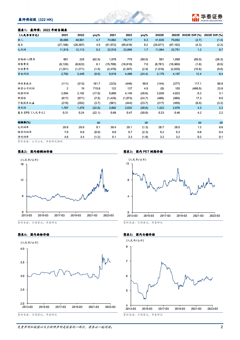 康师傅的毛利率(GPM)在2022年下半年扭转了自2021年以来的收缩趋势,同比略增0.1个百分点至29.9%,主要得益于原材料成本上涨压力的逐步减轻。国内PET聚酯切片、面粉、棕榈油和糖等主要原材料价格在2022年第四季度呈现分化,其中棕榈油价格同比下降18%。进入2023年前两个月,PET聚酯切片同比下降4%,面粉同比上涨9%,棕榈油同比下降29%,糖同比上涨2%。华泰研究预计,尽管宏观环境多变,原材料成本在2023年和2024年仍将持续改善,推动康师傅GPM分别提升1.0和0.9个百分点至30.1%和31.0%。