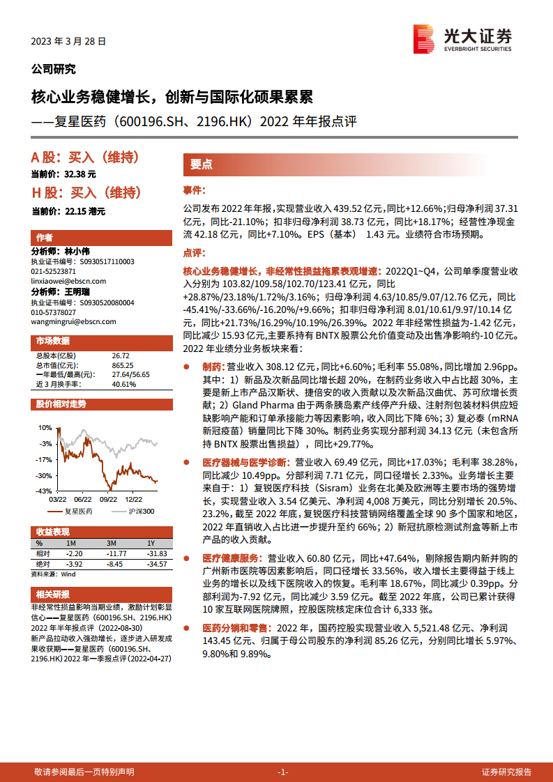 复星医药(600196)2022年年报点评:核心业务稳健增长,创新与国际化硕果累累