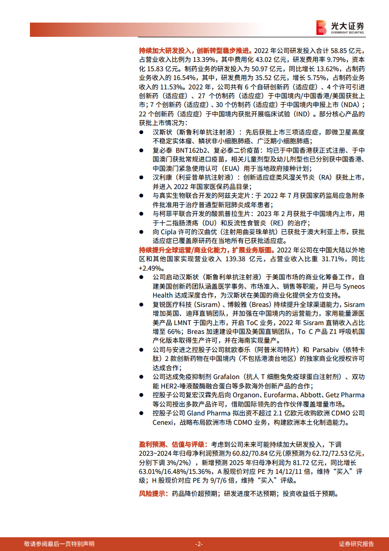 2022年,公司持续加大研发投入,合计58.85亿元,占营业收入的13.39%。其中,费用化研发投入43.02亿元,研发费用率9.79%;资本化研发投入15.83亿元。制药业务的研发投入为50.97亿元,同比增长13.62%,占制药业务收入的16.54%。全年共有6个自研创新药(适应症)、4个许可引进创新药(适应症)、27个仿制药(适应症)在中国境内/中国香港/美国获批上市。核心产品方面,汉斯状(斯鲁利单抗注射液)先后获批三项适应症;复必泰BNT162b2及二价疫苗均已于中国香港获正式注册、于中国澳门获批常规进口疫苗;汉利康(利妥昔单抗注射液)创新适应症类风湿关节炎获批并进入2022年国家医保药品目录;与真实生物联合开发的阿兹夫定片获国家药监局应急附条件批准用于治疗普通型新冠肺炎成年患者。