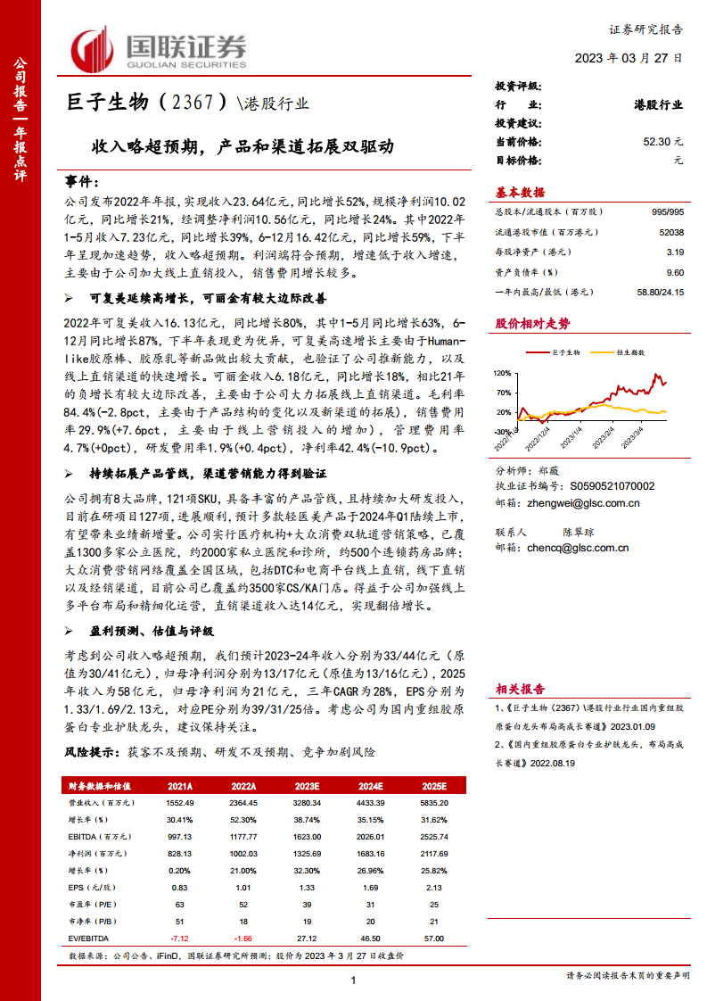 巨子生物2022年年报显示出强劲的增长势头,收入和经调整净利润分别同比增长52%和24%,其中下半年收入增速显著加快。核心品牌可复美凭借新品和线上直销渠道实现80%的高增长,可丽金也通过线上直销实现边际改善。公司持续投入研发,拓展产品管线,并成功实施医疗机构与大众消费双轨道的全渠道营销策略,特别是线上直销收入实现翻倍增长,成为业绩增长的关键驱动力。基于此,分析师上调了未来三年的收入和净利润预测,预计公司作为国内重组胶原蛋白专业护肤龙头,将保持持续增长。