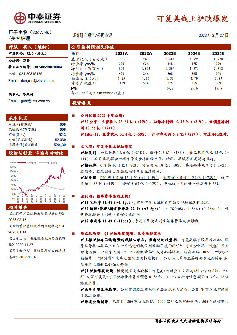 巨子生物在2022年展现出强劲的业绩增长势头,主营收入和净利润均实现大幅提升。其核心驱动力在于线上护肤业务的爆发,特别是可复美品牌在功效护肤领域的卓越表现,以及DTC线上直销渠道的显著贡献。公司成功完成了产品结构优化,将重心转向妆字号产品,并构建了多元化的产品矩阵。尽管毛利率因产品和渠道策略调整而略有下降,销售费用因线上业务扩张而增加,但公司通过持续的产品创新和市场拓展,保持了护肤业务的强劲增长。展望未来,巨子生物有望通过重组胶原植入剂产品在医美领域开辟第二增长曲线,结合其在研发上的持续投入和广泛的渠道覆盖,公司在专业护肤和医美市场的长期成长潜力巨大。中泰证券维持其“买入”评级,看好其未来的发展前景。