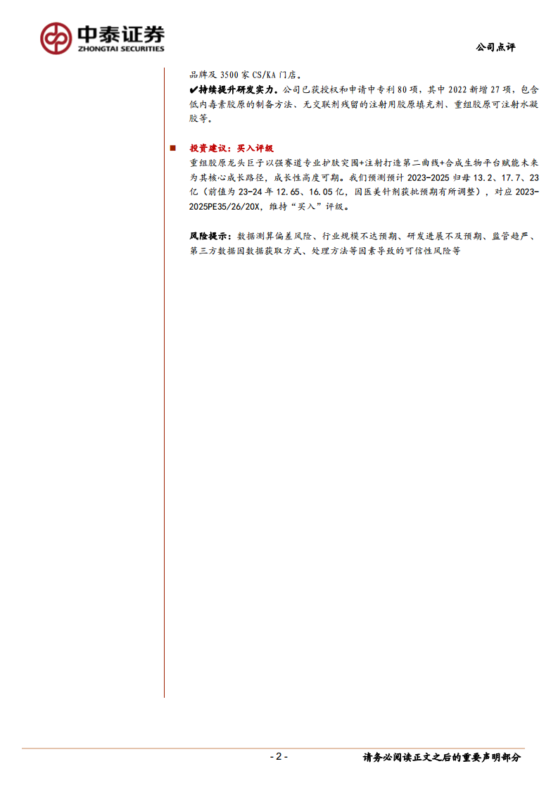 在护肤业务持续高增长的同时,巨子生物积极布局医美领域,其重组胶原植入剂产品有望于2024年Q1获批,预示着公司将开辟医美第二增长曲线,进一步拓宽市场空间。结合公司在研发上的持续投入、多元化的产品矩阵以及广泛的渠道覆盖,巨子生物的未来成长性高度可期,有望通过“专业护肤+医美注射+合成生物平台”的协同效应,构筑长期可持续的多元增长格局。