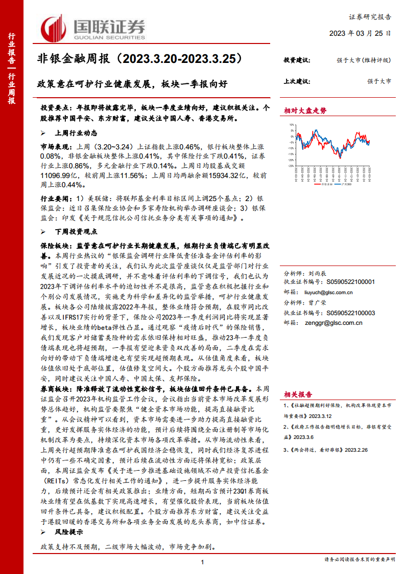 本报告对非银金融行业(保险和券商)进行了专业而深入的分析,指出在2023年3月20日至3月25日期间,该板块在政策支持、流动性改善和业绩向好等多重利好因素驱动下,展现出强劲的投资潜力。保险行业受益于负债端改善和一季度利润的显著增长预期,而券商行业则得益于流动性宽松和资本市场改革的深化。尽管存在政策不及预期、市场波动和竞争加剧等风险,但当前板块估值处于历史低位,具备较大的修复空间。报告建议投资者积极关注中国平安、东方财富等龙头企业,以把握行业发展机遇。