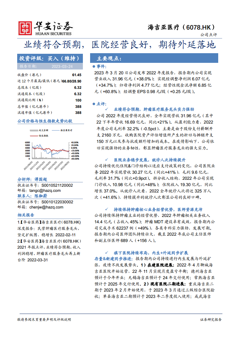 海吉亚医疗在2022年度展现出强劲的业务韧性和稳健的财务表现,其营收和经调整净利润均实现显著增长,超出市场预期。作为肿瘤医疗服务领域的领军企业,公司在疫情挑战下依然保持了核心业务的经营优势,并通过持续优化医院运营和提升就诊人次,进一步巩固了其市场领导地位。