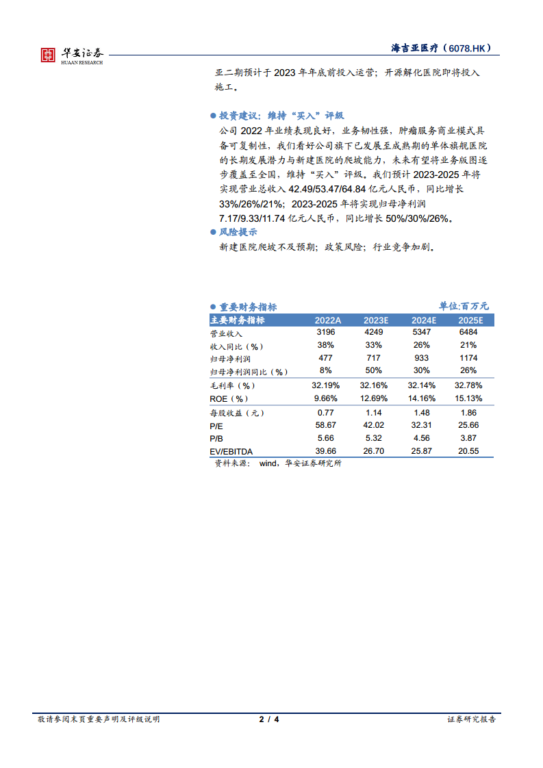 海吉亚医疗在2022年取得了符合预期的良好业绩,充分展现了其作为民营肿瘤医疗服务龙头的强大实力和业务韧性。公司通过持续优化医院运营、提升就诊人次,并积极推进“内生+外延”的扩张战略,不断巩固和扩大其市场份额。未来,随着新建医院的逐步投入运营和现有医院二期工程的推进,公司有望实现营收和利润的持续高速增长。尽管面临新建医院爬坡、政策及行业竞争等风险,但其可复制的肿瘤服务商业模式和稳健的财务表现,使其投资价值持续受到看好。