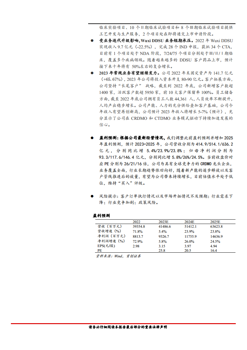 公司凭借充足的产能、人力供给以及稳固的客户基础,预计2023年收入将增长5-7%,充分显示了公司在CRDMO和CTDMO业务模式驱动下持续加速发展的信心。根据公司最新经营情况,分析师调整了盈利预测并增加了2025年预测:预计2023-2025年,公司营收分别为414.9亿元、514.1亿元、636.2亿元,分别同比增长5.4%、23.9%、23.8%;归母净利润分别为93.3亿元、117.6亿元、146.4亿元,分别同比增长5.8%、26%、24.5%。当前收盘价对应PE分别为26倍、21倍、16倍。