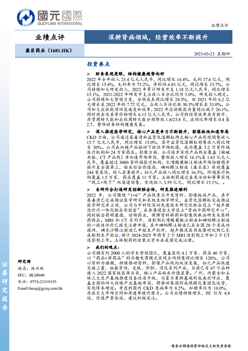 康臣药业(01681):深耕肾病领域,经营效率不断提升