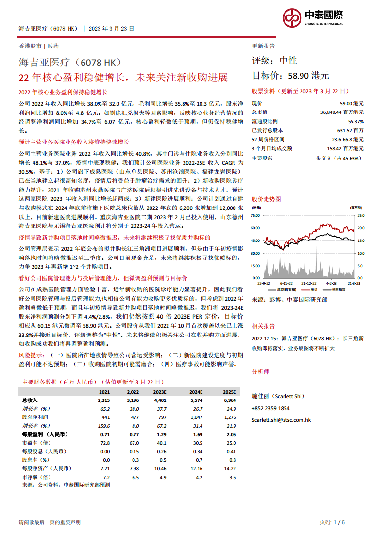 尽管受疫情影响,部分新并购项目落地时间略有推迟,但公司现金流充足,将继续积极寻求优质并购标的。中泰国际认可公司的医院管理和投后管理能力,但鉴于2022年盈利略低于预期及并购延迟,将2023-2024年股东净利润预测分别下调4.4%和2.8%,目标价微调至58.90港元,并将评级调整为“中性”,以反映当前股价已接近目标价的现实。未来公司在收并购方面的进展将是关键关注点。