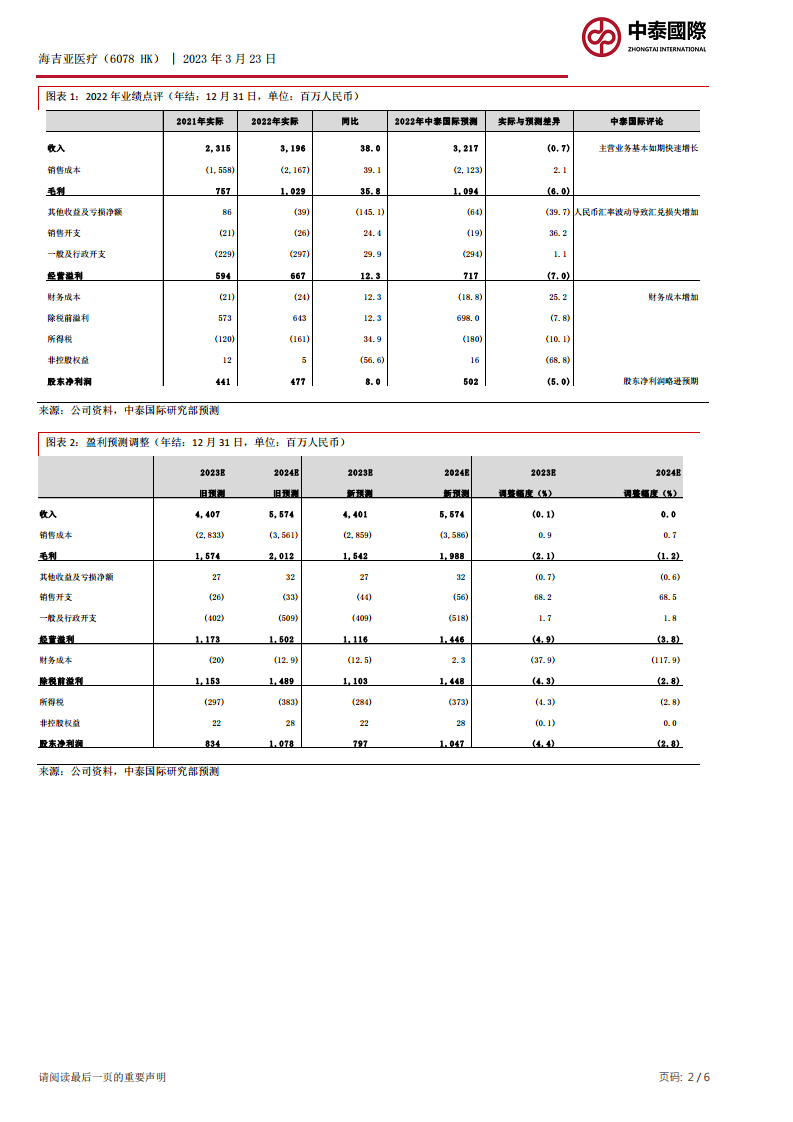 中泰国际对海吉亚医疗在成熟医院管理和投后管理方面的丰富经验及能力表示认可,并相信公司有能力收购更多优质标的。然而,考虑到2022年盈利略低于预期,以及年初疫情导致新并购项目落地时间略微推迟,中泰国际将2023年和2024年股东净利润预测分别下调4.4%和2.8%。