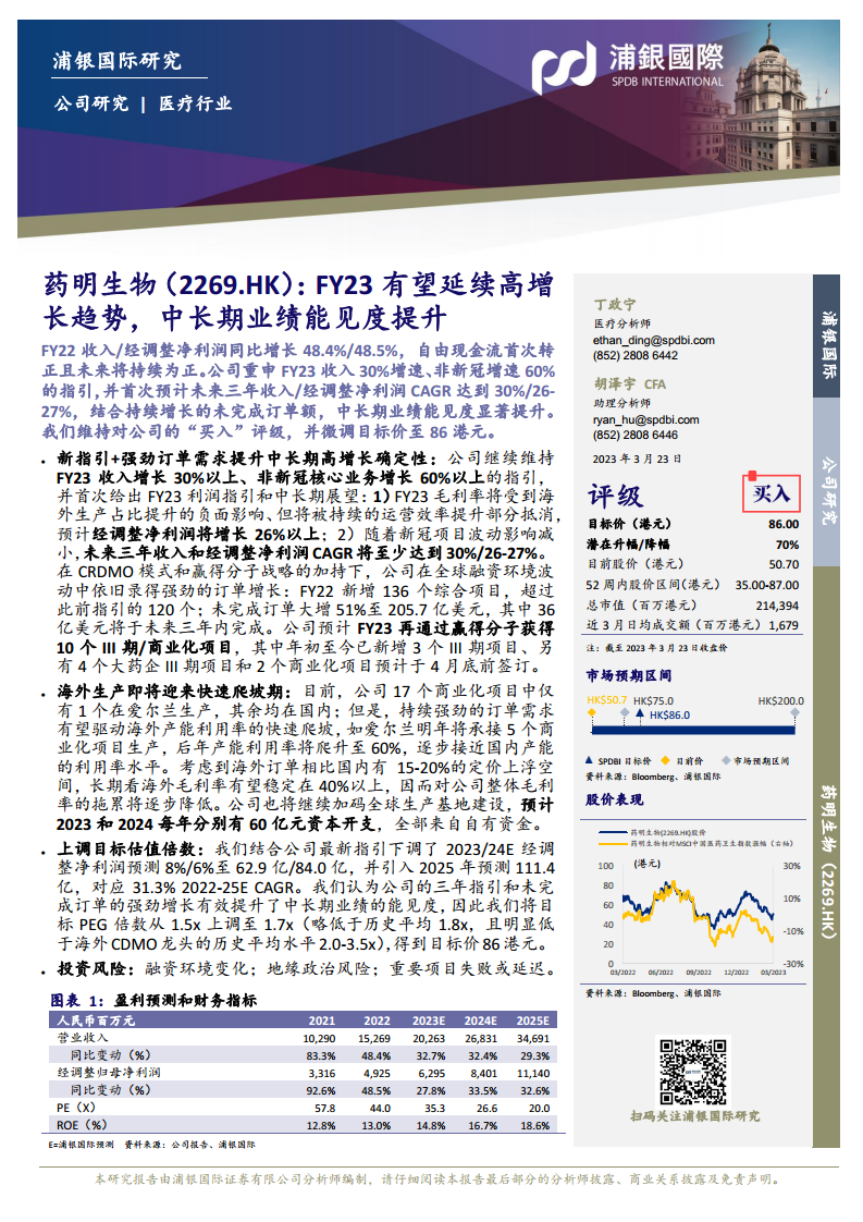 浦银国际结合公司最新指引,微调了2023/24E经调整净利润预测,分别下调8%/6%至62.9亿/84.0亿人民币,并首次引入2025年预测111.4亿人民币,对应2022-2025年复合年增长率(CAGR)为31.3%。鉴于公司三年指引和未完成订单的强劲增长有效提升了中长期业绩的能见度,浦银国际将目标PEG倍数从1.5x上调至1.7x(略低于历史平均1.8x,且明显低于海外CDMO龙头的历史平均水平2.0-3.5x),最终得到目标价86港元,维持“买入”评级,潜在升幅达70%。
