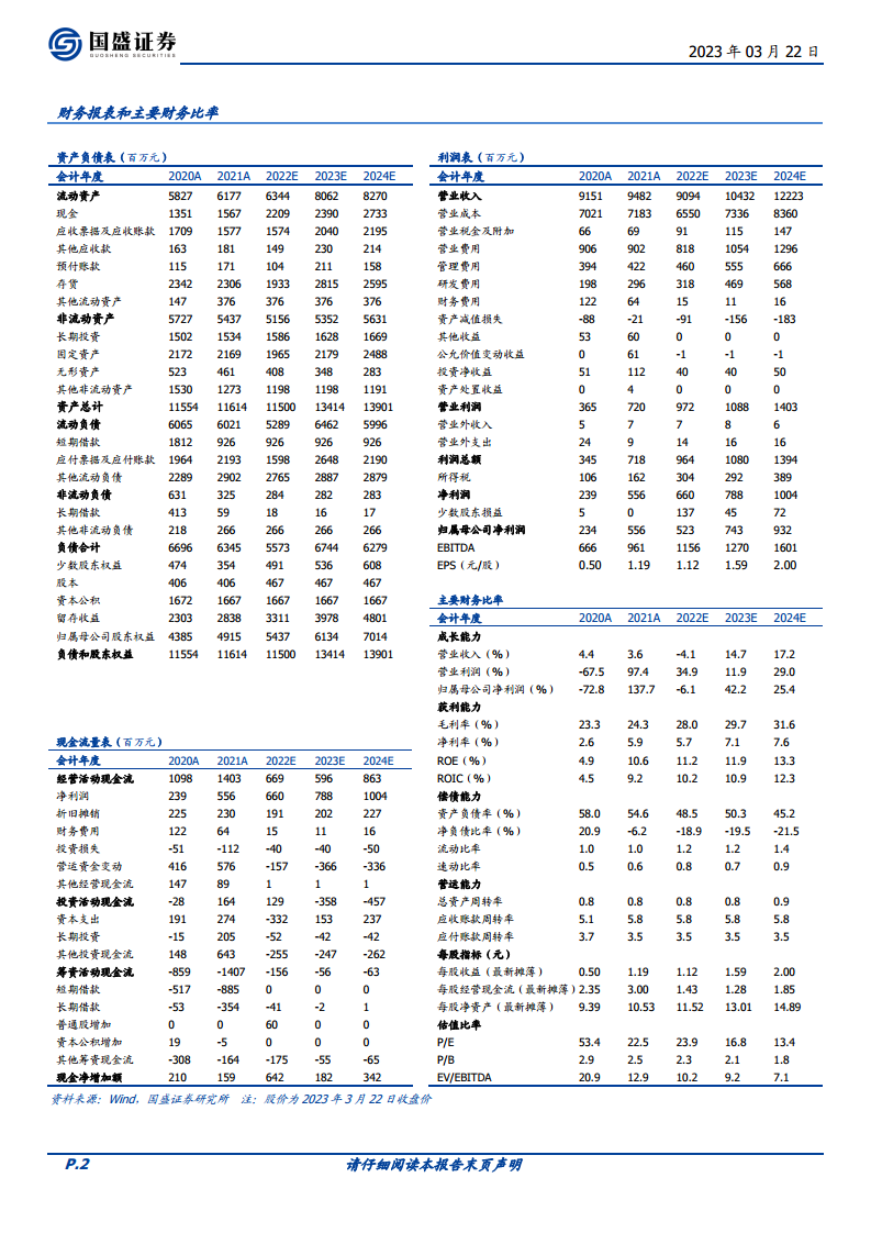 根据盈利预测模型,预计公司2022-2024年营业收入分别为90.94亿元、104.32亿元、122.23亿元,分别同比增长-4.1%、14.7%、17.2%。归母净利润分别为5.23亿元、7.43亿元、9.32亿元,分别同比增长-6.1%、42.2%、25.4%。