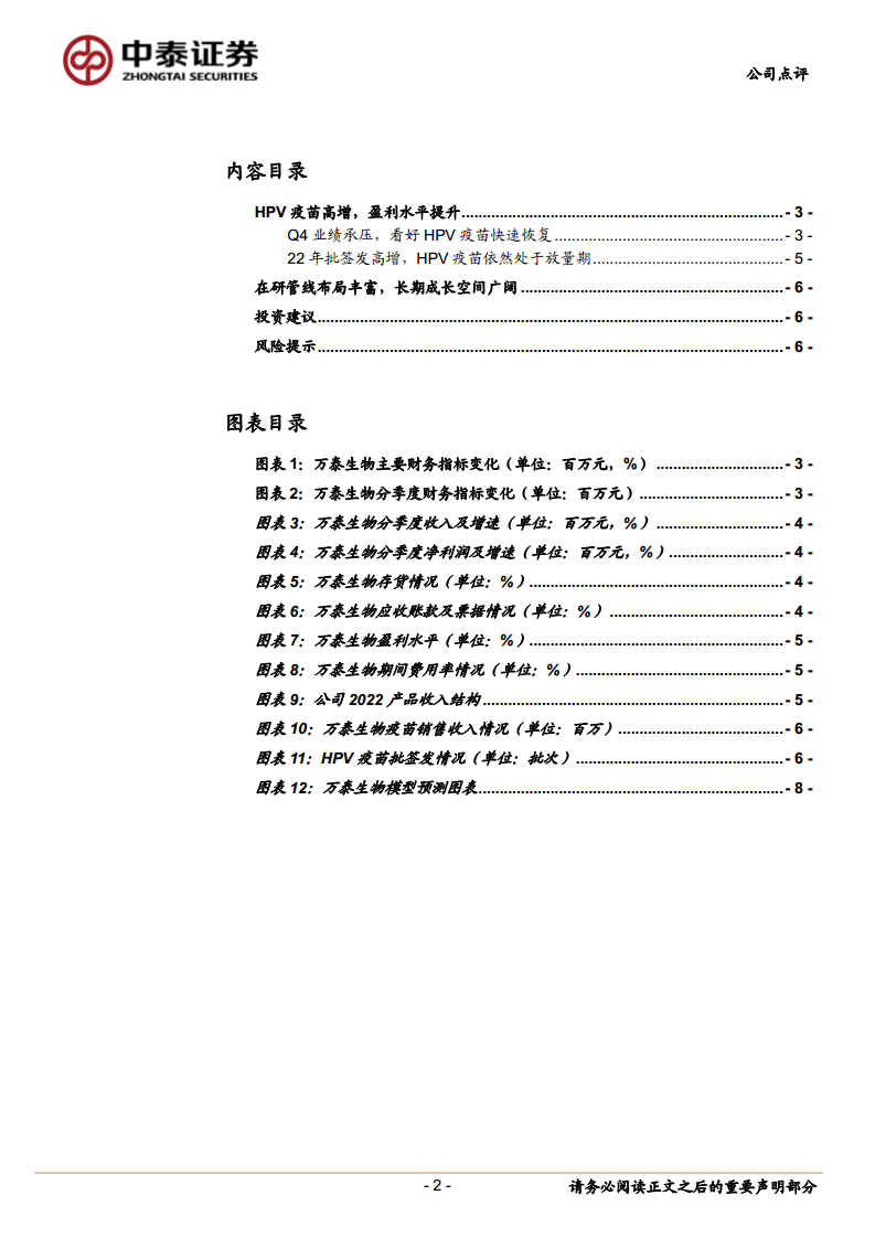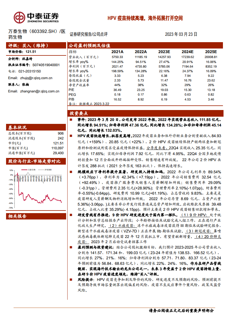万泰生物在2022年凭借2价HPV疫苗的强劲表现和新冠相关业务的贡献,实现了营收和净利润的爆发式增长,分别达到111.85亿元和47.36亿元,同比增长94.51%和134.28%。尽管第四季度业绩受疫情影响有所承压,但公司整体盈利能力显著提升,毛利率和净利率均有大幅增长,显示出规模效应的优势。公司持续加大研发投入,9价HPV疫苗研发进度领先,水痘疫苗、新冠疫苗和20价肺炎疫苗等在研管线布局丰富,为长期成长奠定了基础。同时,2价HPV疫苗在海外市场的成功拓展,进一步打开了国际增长空间。分析师维持“买入”评级,但提示了HPV疫苗竞争加剧、研发进度不及预期、市场容量测算偏差、不良反应事件及政策监管等潜在风险。总体而言,万泰生物凭借其核心产品的市场优势、持续的研发创新和积极的国际化战略,展现出良好的发展前景。