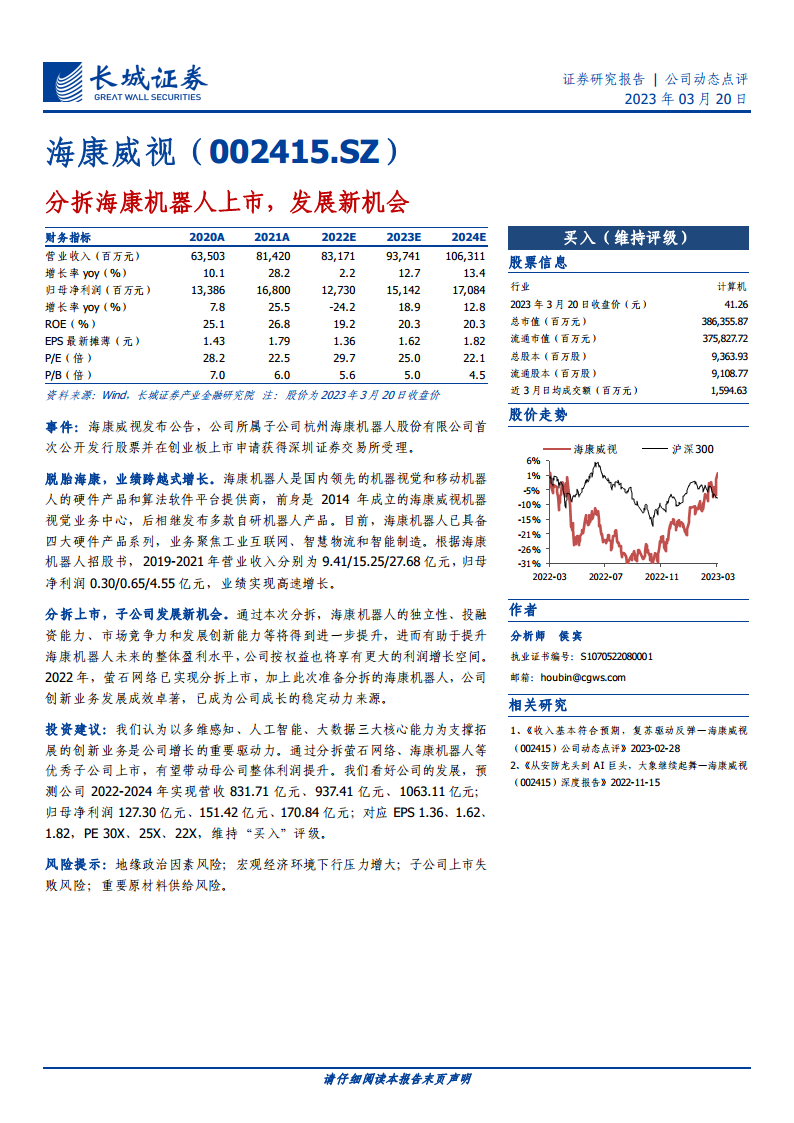 海康威视分拆海康机器人上市是其深化创新业务发展、提升整体价值的战略举措。海康机器人作为机器视觉和移动机器人领域的领先企业,已展现出强劲的业绩增长势头。本次分拆将进一步增强海康机器人的独立运营能力和市场竞争力,同时为海康威视带来新的利润增长点,并巩固其创新业务作为核心增长动力的地位。基于对公司创新业务的看好以及稳健的财务预测,报告维持海康威视“买入”评级,但同时提示了地缘政治、宏观经济、上市失败及原材料供给等潜在风险。
