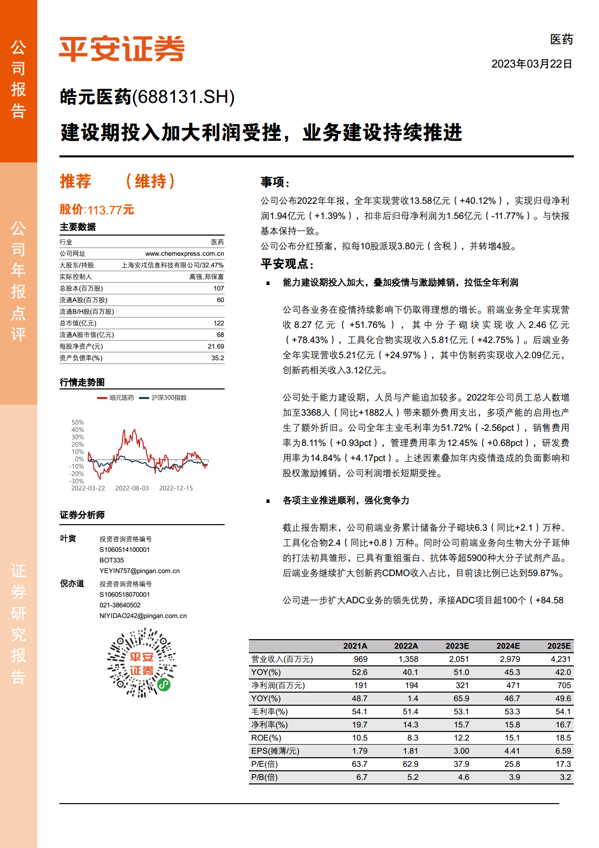 皓元医药在2022年实现了营收的显著增长,全年营业收入达到13.58亿元,同比增长40.12%,显示出公司业务的强劲扩张态势。然而,在能力建设期的战略性投入、疫情影响以及股权激励摊销等多重因素叠加下,公司利润增长短期受挫,归母净利润为1.94亿元,同比仅增长1.39%,扣非后归母净利润更是同比下降11.77%至1.56亿元。这反映了公司在快速发展阶段,为未来增长奠定基础所付出的短期成本。