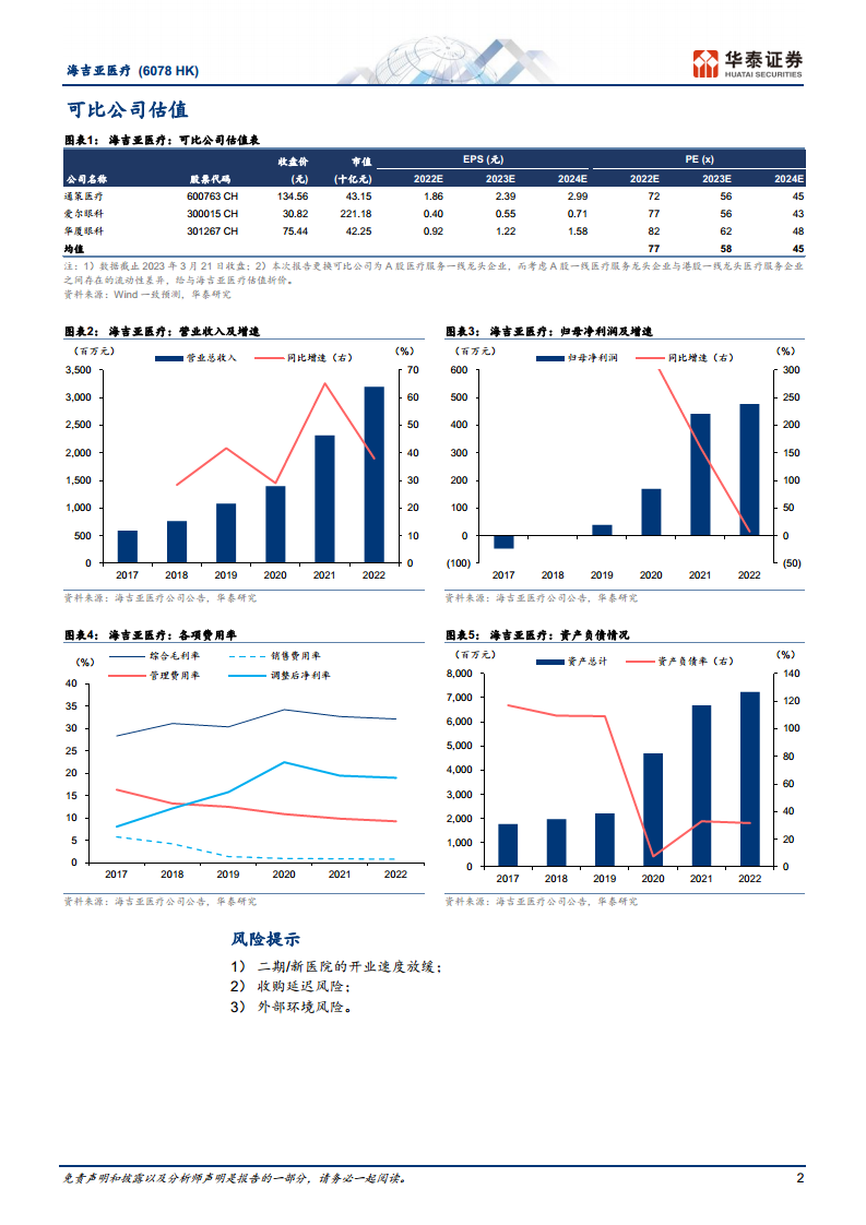 海吉亚医疗在2022年展现了强劲的业绩增长,收入和经调整净利润分别实现38.0%和34.7%的同比增长,主要得益于存量医院的稳健运营、新收购医院的成功整合以及肿瘤MDT学科的持续深耕。公司通过满足刚性治疗需求和提升患者口碑,实现了就诊人次41.6%的显著增长。展望2023年及未来,公司将进入产能扩张的高峰期,通过“收购+自建”双管齐下,预计到2024年底床位数将突破12000张。华泰研究维持“买入”评级,并给予76.49港币的目标价,预计患者持续回归和特色科室入驻将驱动公司实现量价双升,2023-2025年经调整EPS有望持续增长。尽管存在新医院开业放缓、收购延迟及外部环境等风险,但公司凭借其清晰的扩张战略和持续优化的盈利能力,具备显著的长期增长潜力。