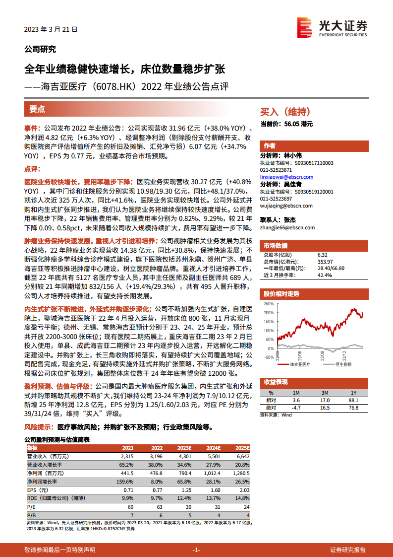 基于公司作为国内最大肿瘤医疗服务集团的地位、持续的内生式扩张和外延式并购策略,以及稳健的业绩增长,分析师维持对海吉亚医疗的“买入”评级。