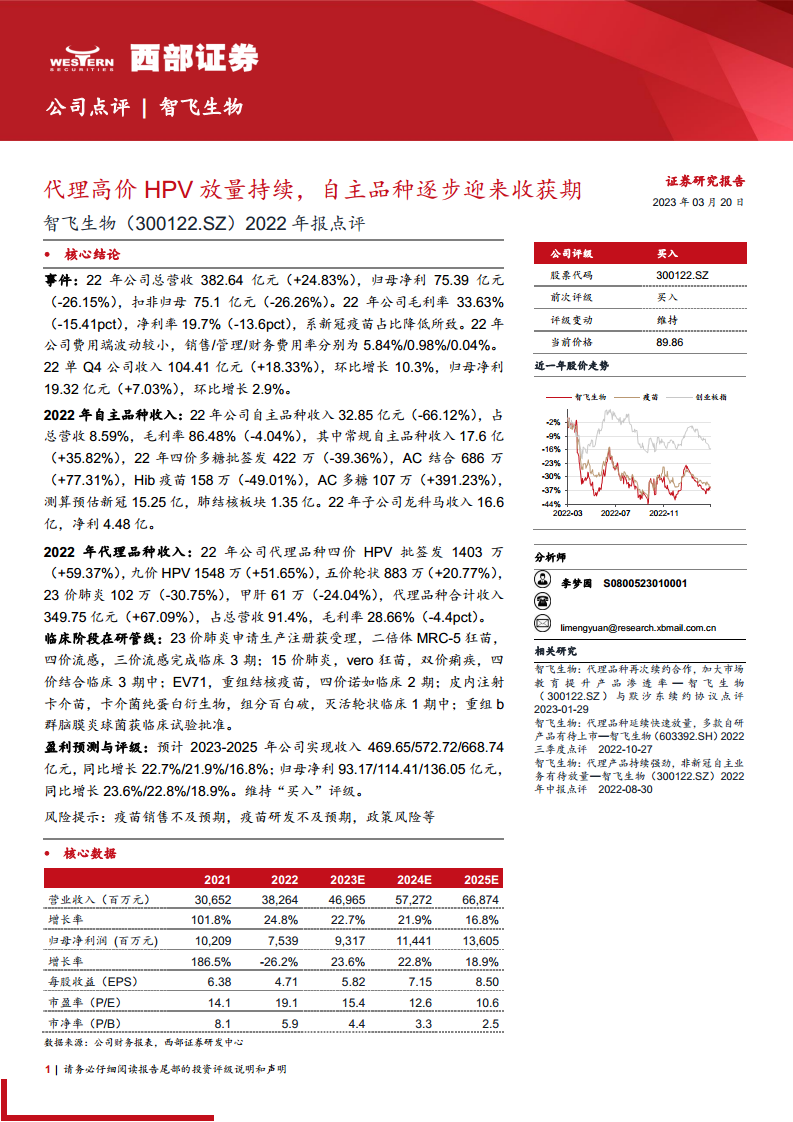 智飞生物(300122)2022 年报点评:代理高价HPV放量持续,自主品种逐步迎来收获期