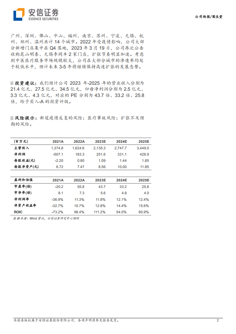 市场扩张方面,公司采取“自建+收购”双轮驱动策略,2022年新增8家门店,覆盖14个城市,并计划在未来3-5年继续保持高速扩张,以抓住中医医疗服务市场的巨大潜力。安信证券基于对公司未来业绩的积极预测,维持“买入-A”评级,但同时提示了新冠疫情反复、医疗事故和扩张不及预期等潜在风险。
