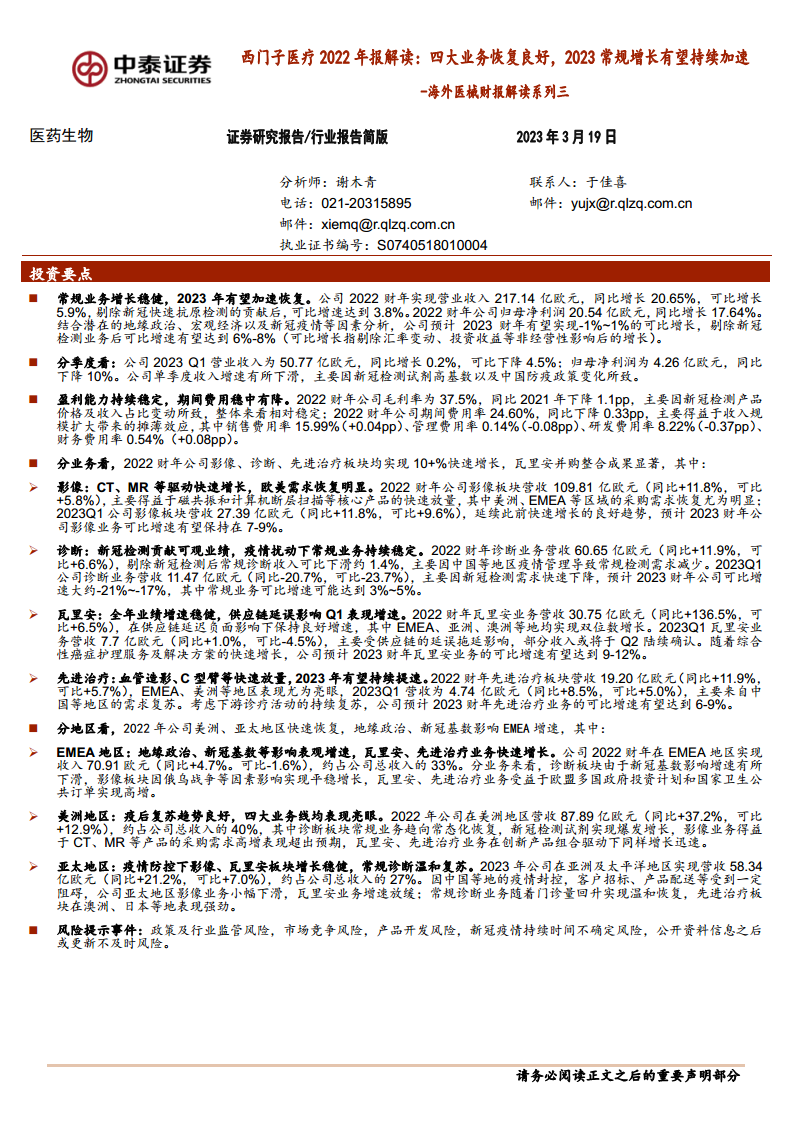西门子医疗2022年报解读:四大业务恢复良好,2023常规增长有望持续加速