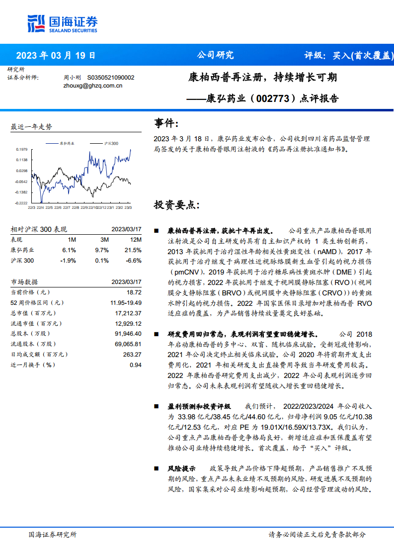 康弘药业的核心产品康柏西普眼用注射液在获得再注册批准后,凭借其广泛的适应症覆盖(包括nAMD、pmCNV、DME和RVO)以及RVO适应症纳入2022年国家医保目录,为公司未来业绩增长奠定了坚实基础。同时,公司研发费用结构优化,表观利润已回归常态并有望实现稳健增长。分析师预计公司未来营收和净利润将持续提升,并首次给予“买入”评级。然而,投资者仍需关注政策性降价、市场推广、研发进展、国家集采以及经营管理波动等潜在风险。