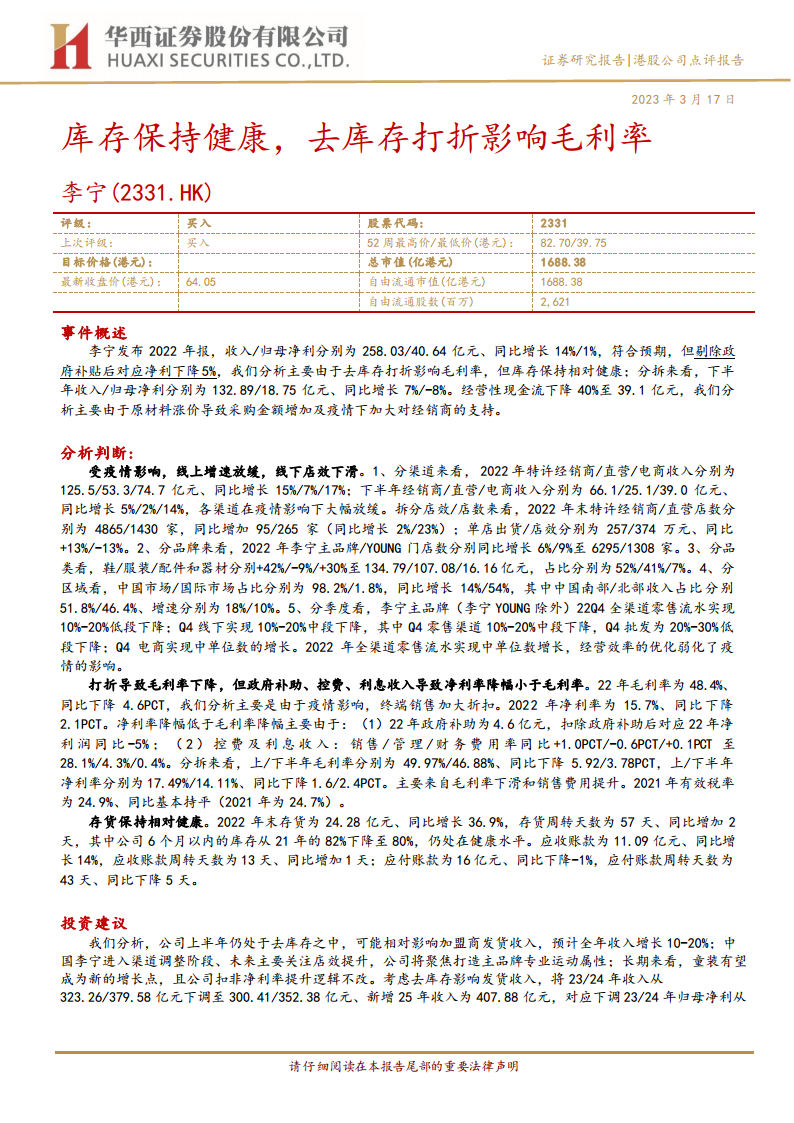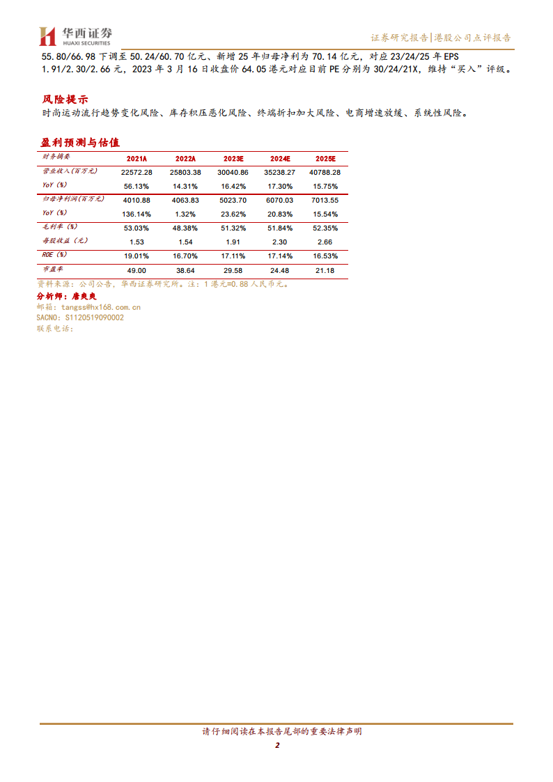 分析师预计,2023年上半年公司仍将处于去库存阶段,可能对加盟商发货收入产生一定影响,但预计全年收入增长可达10%-20%。中国李宁品牌正进入渠道调整期,未来将重点关注店效提升,并聚焦打造主品牌的专业运动属性。长期来看,童装业务有望成为新的增长点,且公司扣非净利率提升的逻辑保持不变。基于上述判断,分析师将2023/2024年收入预测分别下调至300.41亿元和352.38亿元,并新增2025年收入预测407.88亿元。相应地,2023/2024年归母净利润预测分别下调至50.24亿元和60.70亿元,新增2025年归母净利润预测70.14亿元。调整后的2023/2024/2025年EPS分别为1.91/2.30/2.66元。以2023年3月16日收盘价64.05港元计算,对应2023/2024/2025年PE分别为30/24/21倍。