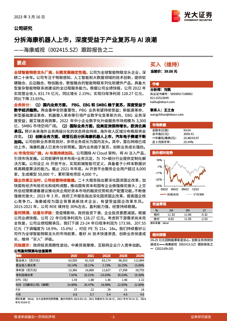 海康威视(002415)跟踪报告之二:分拆海康机器人上市,深度受益于产业复苏与AI浪潮