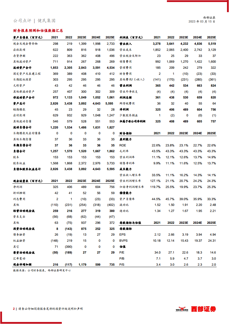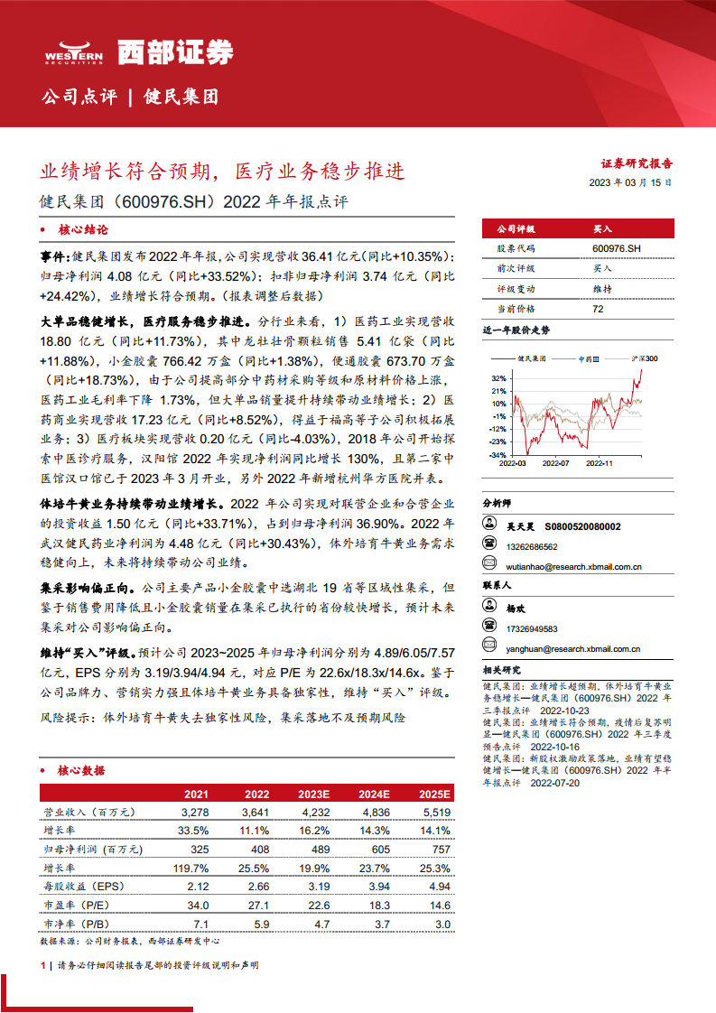 基于公司强大的品牌力、营销实力以及体外培育牛黄业务的独家性,分析师维持健民集团“买入”评级。预计公司2023年至2025年的归母净利润将分别达到4.89亿元、6.05亿元和7.57亿元,对应每股收益(EPS)分别为3.19元、3.94元和4.94元,市盈率(P/E)分别为22.6x、18.3x和14.6x,显示出良好的投资价值。