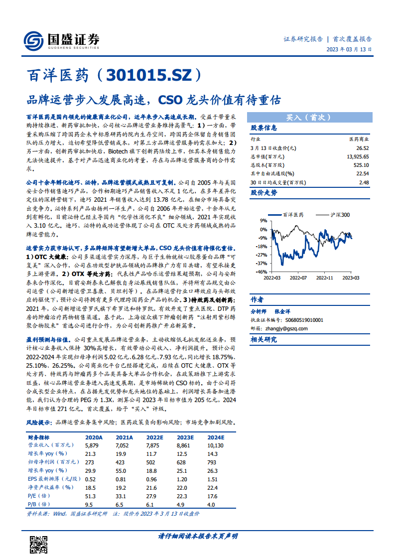 在医药产业链分工日益细化的趋势下,百洋医药作为市场稀缺的CSO(合同销售组织)龙头,其价值正逐步凸显并有待市场重估。公司凭借其先发优势、深厚的行业口碑和强大的渠道壁垒,持续获得上游优质品牌方的认可与合作,如与安斯泰来在泌尿线产品上的深化合作,以及与上海谊众在创新肿瘤药领域的首选合作。财务数据显示,公司核心品牌运营业务收入和毛利额均保持高速增长,且销售费用率管控良好,人效显著提升。基于对公司未来业绩的乐观预期,预计2022-2024年归母净利润将分别实现18.75%、25.10%和26.25%的同比增长。鉴于公司符合成长型企业特征,且具备加速增长的潜力,报告首次覆盖给予“买入”评级,并测算2023年目标市值为205亿元,2024年目标市值为271亿元。